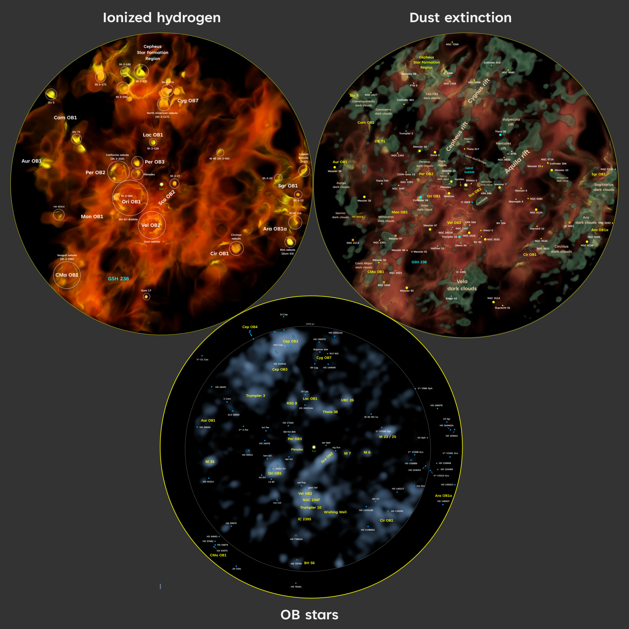 Maps of the Milky Way based on Gaia DR3 that show different properties of the interstellar medium out to 1250 parsecs (4000 light-years).